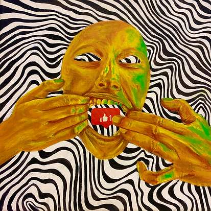 This piece represents the feeling of paranoia, emptiness, and distress we feel when separated or "unplugged" from social media. The withdrawal and struggle is shown in the eyes. The blue figure represents a sense of losing yourself, since it's so abstract and flat. I was inspired to create this piece from my own experience. My phone broke for a day, and I couldn't use the social media apps that I'm used to using every day. I felt detached and left out from other people's lives. I realized how much I really do depend on social media, and how often it's actually used throughout my day.